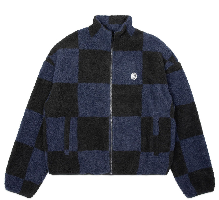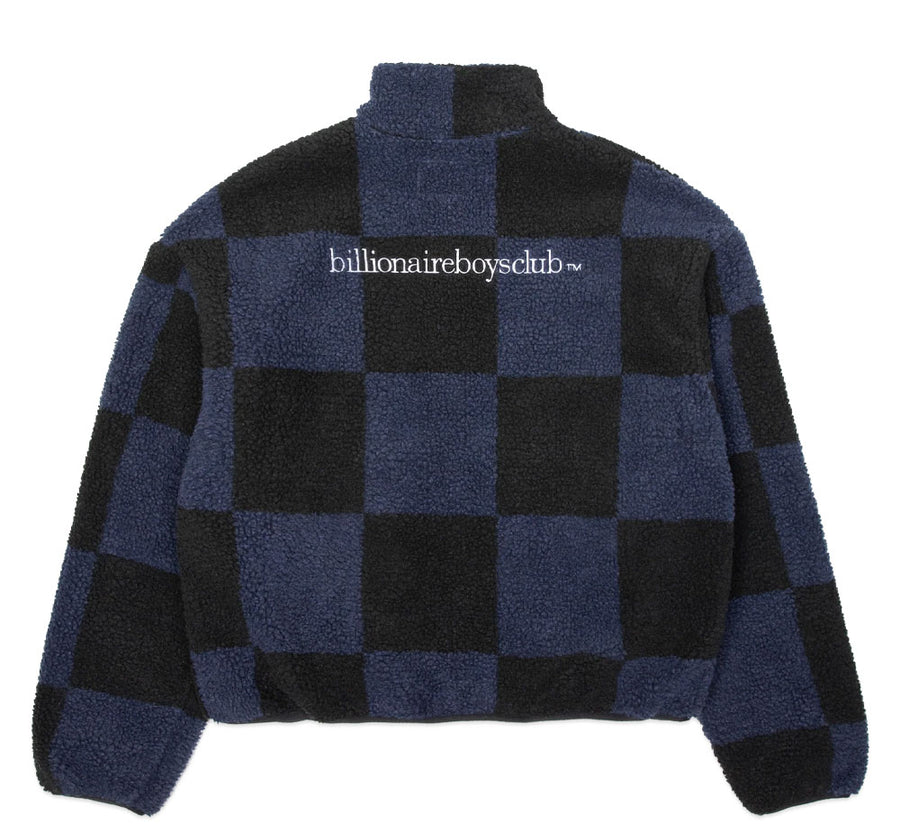 The MAGNETIC JACKET features a checkered jacquard patterned faux sherpa zip-up design, and a helmet head logo printed at the front left chest and minimalist Billionaire Boys Club logo on the back.