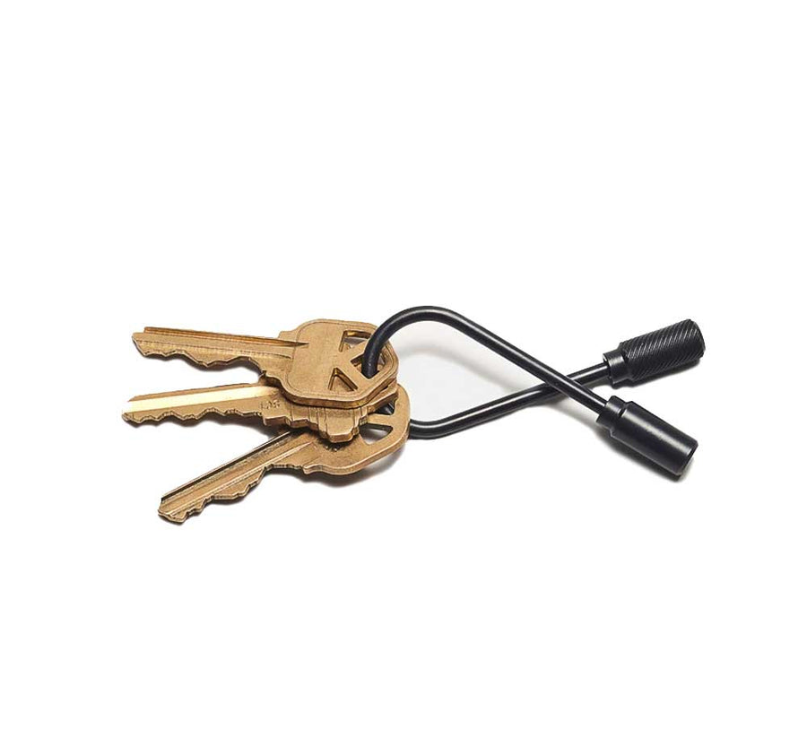 A helix-shaped brass wire with turned end-caps. Simply unscrew the knurled side to add or remove keys.