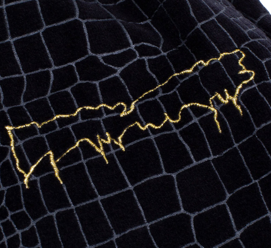 Soft Cotton Backed Velour Fabrication with Custom Croc Skin Burned Out Pattern.