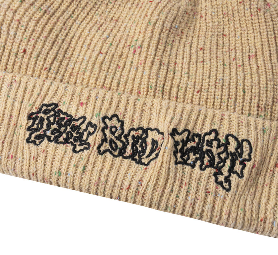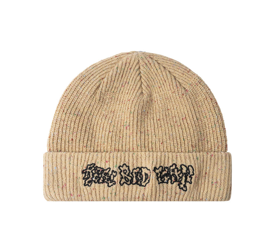 Cotton rib knit beanie with flecked colors. Embroidered front, semi illegible on purpose…
